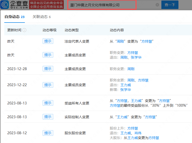 企查查APP显示,近日,肖战前工作室厦门仲夏之月文化传媒有限公司发生工商变更,周刚卸任法定代表人、执行董事职务,张学华卸任监事,方持慧由经理变更为经理、董事、法定代表人。